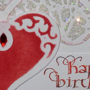 hard rubber mallet to emboss the design in the open area. Die cut the medium ornament (Spellbinders "Nested Hearts) from white cardstock, sponged with Distress Festive Berries, sponged the back of the little tab and then brought the tab down and adhered it to the front of the heart, added a small red rhinestone. Stamped my sentiment with Versafine "Habanero" and touched it with some Black Onyx on a scrap piece of white cardstock and trimmed it down. Adhered it to card and pop dotted the red heart. |