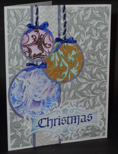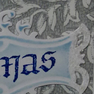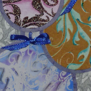 when it comes to these - I have no qualms - I love them... Die cut several Spellbinders circles from white cardstock and applied various techniques: Largest (Flourishes "Damask" bkgr'd) stamped with Perfect medium and clear embossed. Painted with Daniel Smith watercolors (Ultramarine Blue & Rhodinite Genuine) dried, edged the stamping with a pencil and blending it a bit for a shadow, ironed off the embossing. Smallest, uses the same stamp, stamped with Versafine Toffee and embossed with JudiKins Rustique Tin Can and painted with the Rhodinite. Medium ball, Uses the reverse stamp of the Damask bkgr'd, stamped with Perfect Medium and embossed with JudiKins Translucent Gold and painted with Phthalo Turquoise. All the balls were layered on to the blue distressed paper, using the subsequent circle die and cutting around the edge of it. Added the braided silver/blue metallic rope and a blue ribbon bow on each ball. The word stamp was stamped with Versafine Majestic Blue, clear embossed and die cut with Fancy Tags 2, sponged around edges with Faded Jeans Distress pad, and both ends I applied glue and Pro Art Glitter "Crystal" (chunky style). Adhered it to the card with pop dots. |