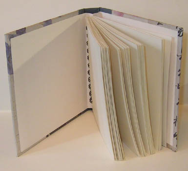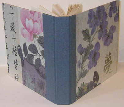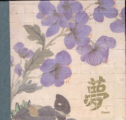 I recently bought a book (Modern Mark Making by Lisa Engelbrecht) that had a binding I hadn't thought about, but realized it had the best of both worlds - a coil binding in a hard cover journal with the coils not being seen from the outside. I started out cutting square pieces of paper using cream colored LBS end sheets from Columbia Mills. Punched them with my Zutter and put them aside. The sub cover that holds the text block and the zutter wire (5/8" wire) and attaches to the hard cover was made with cream toned Stonehenge paper and reinforced in the spine area with Linen Hinging Tape. I wanted something that was strong yet has a long wear and tear factor for folding and unfolding. When the holes were punched and the wire inserted into it and the text block, I put that aside. The covers and spine piece are made from book board and the spine area is covered with a smoky grey linen book cloth. The front cover is done with a weaving technique I just learnt at a friends house. It uses two pieces of paper with the same design on both papers. One has vertical slits cut into it and the other has horizontal strips cut out of it and then woven into the slotted piece. Both the slits and the strips have a miniscule sliver cut off of them for better fitting and matching of design. When the weave was completed I glued it to my cover board. Then stamped the Asian symbol for "Dream" using Versafine stamp pad (a mix of Spanish Moss and Smoky grey). The back is spliced together from sections remaining from the Asian paper and the left hand leaf was slightly cut out to overlap the Asian text piece and make it look like one piece.. |