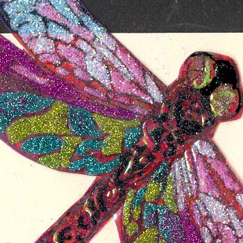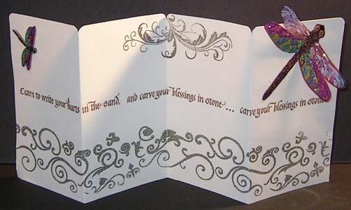 I used cream toned LBS end sheet paper from Columbia Mills for the accordion card. I used two new products on this card. The first being the "Memory Essentials" jumbo Get Rollin'. It's like a Rollagraph, but you can put clear rubber stamps or other things you want on it to create repeat patterns, at least that's how it's advertised. Well it doesn't work with all clear rubber stamps and it took me a while before I found rubber stamps that actually worked on it. Forget about using Inkadinkado with it; Fiskar's Heidi Grace was a trial, some of the smaller ones stuck, but anything a bit larger kept lifting off; MSE worked well and Hero Arts, which is what I used for the card worked well. There are other brands I still need to try. I also punched out designs from thin Fun Foam and stuck them on. Worked well. I stamped the border with a clear stamp pad and then embossed with White Gold. Rubber stamped the quote (Quietfire Design "Learn to Write...") with a Versafine stamp pad "Vintage Sepia". The quote stamp is altered from the original. I need the stamp to be all on one line, whereas the stamp is actually written on two lines. It was also a bit short for my card so I repeated the end portion and added the three dots between the end of the quote and the repeat portion. The flourish quote on top is (Stubby Stampers #4039) done with a black stamp pad and Holographic embossing powder. The other product that's new is the Fantasy Film. Interesting product. I've seen wonderful stuff done with it, but I have a long way to go to get anywhere near what I've seen. I used three colors onto an inked rubber stamp of a large dragonfly. Then colored in the wings with Micro Glitter by Glitter Ritz and metallic and Glaze Gel pens. Cut it out and stuck the body section to the card with Diamond Glaze. The other dragonfly is the same rubber stamp but done on Clear Shrink Plastic and colored in with the same gel pens and baked in the oven to shrink. |
