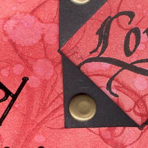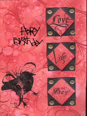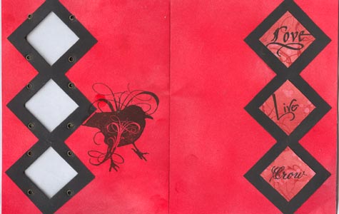 Used Pan Pastels to color the inside of the card using Permanent Red and wiping with a tissue, then spraying with workable fixative. On the left side you can see the back of my tab squares, the white is the cover of my scanner. On the right side I cut out a duplicate of the black cardstock and adhered my cut out pieces that I had put aside before. Rubber stamped the flourish crow again but with Versafine Onyx. The words Love & Crow are from Quietfire Design. The word Live is from Serendipity Stamps. |