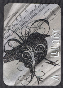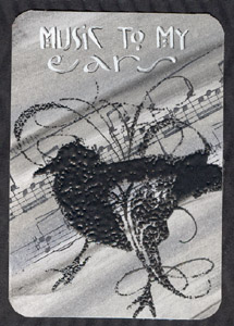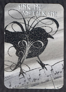 Size: 2.5"w x 3.5"h each ATC This week's challenge was to use the colors Black, White & Grey. I've been playing a lot with Pan Pastels. (I absolutely love them), but have always been using colors. I thought why not try them in the grey tones. I'm very happy with the backgrounds created with (Black, White, Neutral Grey & Payne's Grey). OK so the backgrounds are done now. What next. Then I went naturally to the recent release of rubber stamps by Quietfire Design "Crows", love them too. The crow is naturally black and music is usually written in black, so voila. I rubber stamped the music notes with Distress Dye Ink "Black Soot" and the crow/flourish with black pigment stamp pad and embossed with Hematite (similar to black). Added my words with a quill nib and Dr Martin's Bleed Proof White ink then did a shadow stroke with a Black Pigma pen. The central crow was rubber stamped on a blank stamp then stamped on the ATC to get the mirror image (did have to go over some sections that didn't ink completely(. |