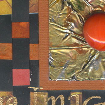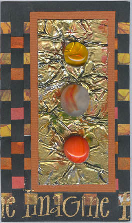 I went to a friend's house a saw an absolutely fabulous background done on aluminum using acrylic paints. I came home and tried to recreate what I saw. This is a far cry from it. Will have to try again, but worked out well none the less. For the aluminum piece I used the plumber's silver tape which I scrunched up to get good creases in, then painted with Golden's fluid acrylics in Yellow Ochre, Hansa Yellow Medium, Naphthol Red Light, Green Gold and Phthalo Green (Blue Shade), each mixed a a bit of water. Applied it randomly and allowed to dry. Brushed over the whole surface with Golden's Iridescent Bronze (Fine) also mixed with water. When that was dry, I rubbed over the high points with a Staz On black stamp pad. Removed the protective backing and adhered it to a pumpkin colored Bazzill Monochromatic cardstock. The black background is a thick piece of cardstock which I wove several different orange toned strips of paper through, then adhered my aluminum piece. Rubber stamped the word "Imagine" (Roann Mathias) in the center and then portions of the word on either side, with a Brilliance gold stamp pad and Queen's Gold embossing powder. Glued on my 3 mini glass globs with Golden's soft gel medium (24 hours later they are still slightly opaque and I guess need another 48 hours to dry completely. |