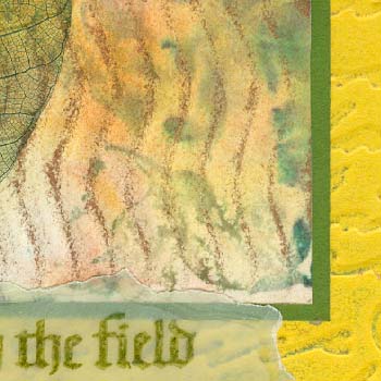 I had made a background on white 65# cardstock using Pan Pastels (Orange, Hansa Yellow, Touch of Permanent Red, Bright Yellow Green Shade, & some Burnt Sienna) applied with the Pan Pastel makeup sponges and wiped with a tissue to blend. Misted the paper with water and used a Rollagraph Border leaf pattern using Adirondack Rainbow dye ink (Winter Sky). So when rolled on the misted paper it softly bled and became a muted background. When dry, ran it through a wavy paper crimper, then rubbed Metallic Rub Ons "Copper" on the high points. Mounted this to a piece of The Paper Co "Cypress" Collection "Light Ivy" cardstock. Mounted this to the yellow cardstock. The yellow is from the same package and ran it through my Cuttlebug using the "Script" embossing folder then used the Metallic Rub Ons in a couple of the green colors and some copper. Mounted this to my main brown card (also from the same cardstock collection). Glued on the two skeleton leaves using Diamond Glaze. Rubber stamped my quote (Quietfire Design "Every Blade of Grass") using Staz-On Olive on a piece of green Vellum and glued it to the card with the Diamond Glaze. |