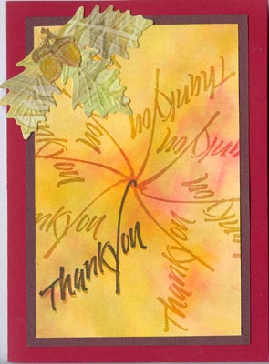 I used regular cardstock and rubber stamped the "thank you" repeatedly, so that each time the tip of the "y" would land in the center to create a pinwheel type effect. I used Ranger's Resist stamp pad, then applied Pan Pastels in various fall colors. I then rubber stamped the word again with Versafine, but slightly over the original stamping, almost like a shadow. I punched out some fall leaves and an acorn using a Spellbinder's die set and my Cuttlebug and some Paste Paper I made a while back. I touched up the acorn a bit so it had a bit more brown in it. Cut my larger paper (which was about 6 x 6.5") down to a size for my card (4 x 6") and mounted it to a Mi-Tientes burgundy cardstock, then onto my main card, a regular burgundy red cardstock