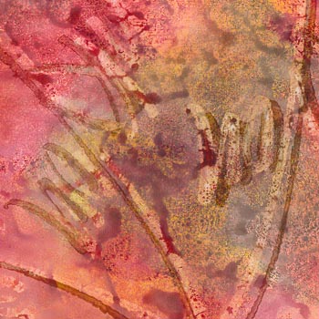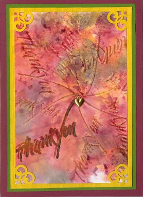 I used glossy cardstock and rubber stamped the "thank you" repeatedly, so that each time the tip of the "y" would land in the center to create a pinwheel type effect. I used Ranger's Resist stamp pad, then using a sponge, applied various Distress dye inks all over the page. Then lightly misted a melt art mat and lay my gloss paper face down on the moisture, lifted it off and let dry. I over stamped each word with a Versafine Smokey Grey stamp pad. I then rubber stamped the word again with Versafine, but slightly over the original stamping, almost like a shadow with a mix of the Sepia & Black, then did a single stroke in each letter using Sakura Gold Metallic gel pen. I Attached a heart (also available at Quietfire Design) using very thin beading wire. Cut my larger paper (which was about 6 x 6.5") down to a size for my card (4 x 6") and mounted it to a bright yellow Bazzill Monochromatic cardstock which I used a heart corner punch, then onto a regular green cardstock and then onto my main card which is a kind of burgundy color. All the colors match the dye inks I used.