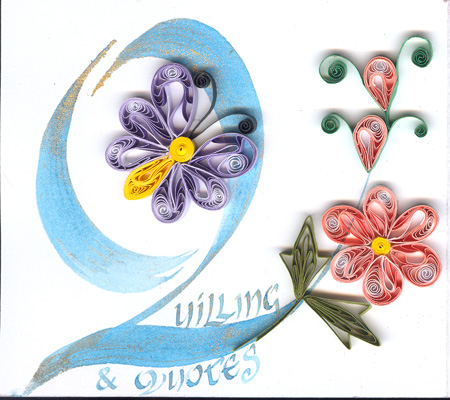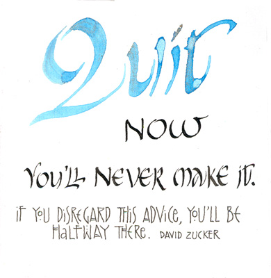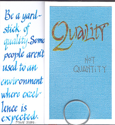 I used white 110# cardstock in accordion fold style. The letter Q on the front is done with a medium automatic pen using a blue/green gouache with gold powder floating on top. The smaller lettering was done with a Mitchel small nib. |