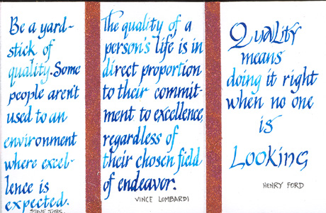 I wrote the quotes using a Mitchel small nib and Dr Martin's drawing ink in a turquoise color. The 2 vertical bars was done with Sookwang double sided tape and Ritz Glitz glitter in a coppery tone. |