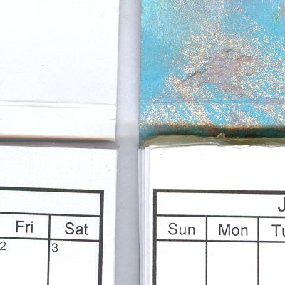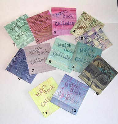 I used some of my recent paste paper done on cardstock for the covers. The detail pics show the gluing I used and the one on the extreme right was a prototype. There are a couple that have that type of hot glue to hold the pages together. The one on the left is done with white Tacky Glue by Aleene. I split each month onto 2 pages and then put a blank page between each month for extra notes. I also added another strip on the bottom section of the matchbook closure to hide the staples and prevent getting snagged by them. I rubber stamped the words "Match Book Calendar" onto each cover. |