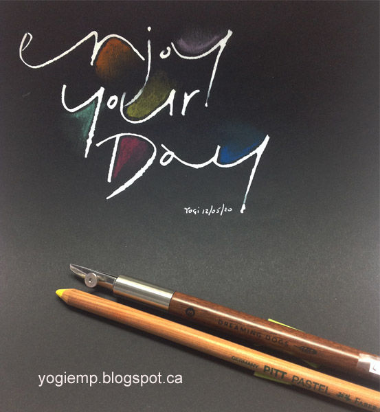 Your Day on Michael's black cardstock, using Bleed Proof white and a Dreaming Dogs "Little Lie" ruling pen, wrote out my words. Added color with Faber Castell Pitt Pastel pencils and blended with my finger tip. I love the vibrancy of the pastels on the black against the white writing. Have to do more of this... |