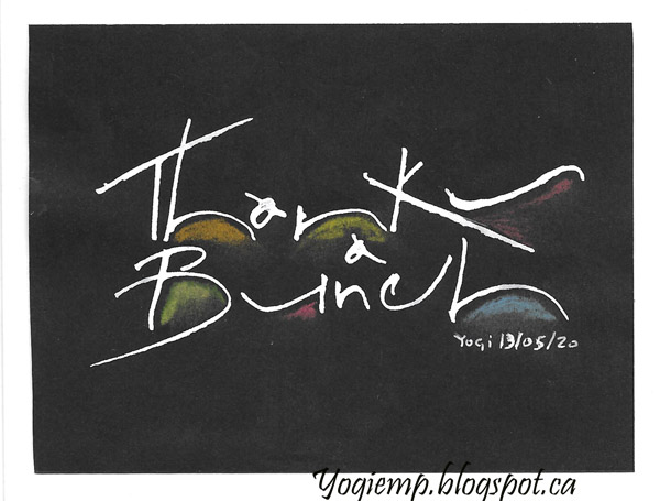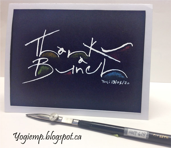 ID: Akim - Thanks a Bunch On basic black cardstock and using the Haff 629 ruling pen and Bleed Proof white ink wrote out my words. Used both Pitt Pastels and Stabilo pastels. Trimmed down and adhered to a top fold white cardbase. |