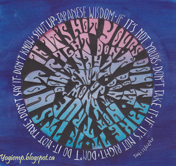 Day 3 On Bee Super Deluxe paper drew my circle and painted inside with 3 waves of color blending where they overlapped. Then painted around the circle with Winsor Blue (red). Drew my Wes Wilson inner text and painted the negative areas with a ZIG Writer and Sharpie... Wrote the outer text with a pointed nib and Bleed Proof white ink. Since this style is hard to read for many people, I wrote it in monoline around the circle... I shortened the quote by not using the words "if it' in the 3rd sentence and "if you"in the last sentence. words: If it's not yours, don't take it. If it's not right, don't do it. Not true, don't say it. Don't know, shut up. Japanese wisdom |