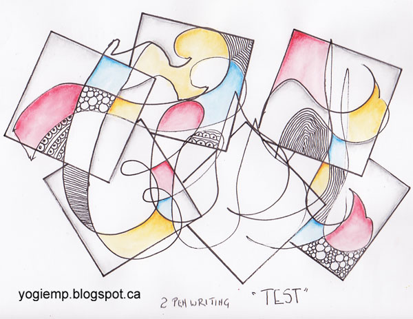 2023 I've been checking out a lot of Instagram stuff and came across writing with 2 pens. I written with 2 pencils a long time ago, but I don't think ever with pens. I didn't even bother to tape them together... Done on Canson Pro Marker paper (I LOVE this paper...) using 2 black ZIG Writers wrote the word "test" in lower case letters. Then added squares here and there, adding color with Derwent Intense watercolor pencils and moving the color around with a wet paint brush. Added doodling with a Pilot Juice Up pen. Left one of the squares undecorated... I really love the look of this... |