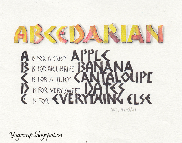 Created: September 9, 2021 It's a Guild Galleria Challenge for our Oct 2021 meeting. On Arches Textwove paper, using a 4.5 Parallel pen filled with Ecoline "Scarlet" and double dipped into Pearlescent Genesis Green, wrote out the title in Neuland style. Shadowed with a Micron pen and then Graphite pencil and Paper stump. The rest was done with a 2.4 Parallel pen and Sumi ink