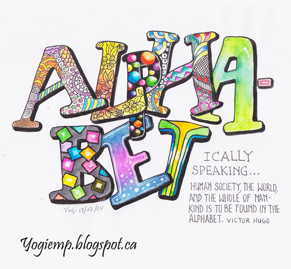 ALPHABET-cally Speaking - Victor Hugo Created: July 14, 2024 size: 7"w x 6"h I'm sitting outside on this glorious sunny day and had no direction of which direction to go artistically... so I started drawing a big funky "A" and the rest evolved... on thought after another... On Canson Pro Marker paper using just about everything I had on my table outside... Juice Up pens, Regular and Metallic Gel pens., Posca Colored pencils. Derwent Inktense, W&N & Peerless watercolors... wrote out the big letters. The I just had to put a big shadow line. When done it needed something else and the "ically speaking..." popped into my head. Then of course I needed a quote to go with it and Victor's was just right... words: Human society, the world, and the whole of mankind is to be found in the alphabet. Victor Hugo