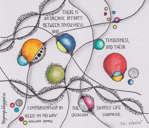 2025 size: 5"sq I've recently come across on Facebook (NeuroClub - For NeuroGraphica and Art Lovers) artwork that I love... doodling and circles. So I played a bit... On Edge Mixed Media paper using a Zig Writer, Posca colored pencils, Lyra Splendor Blender and Juice Up pen. words: There is an affinity between joyousness and tenderness, and their companionship in the saintly life need in no way occasion surprise. William James |
