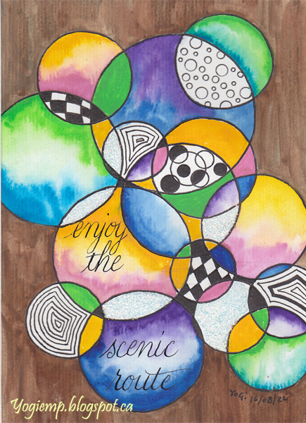 2022 I've really been in the mood to create abstract art... On Canson Biggie Jr w/c paper and using a circle template drew them with a Micron .03 and after painting thickened the lines with a Zig Writer. Painted with various brands of watercolor paints. Doodled with a .03 Micron pen. Applied glue with a Zig 2Way glue pen and sprinkled with Stickles "Diamond" fine glitter. Wrote the quote with a pointed nib and Sumi ink. |