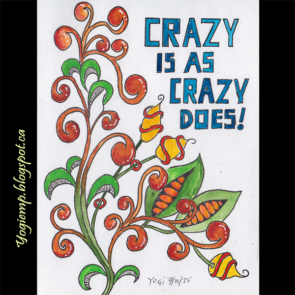 size: 6"h x 4.5"w On Canson Mixed Media paper created the doodle design and painted with various w/c. Drew out the words with a ZIG Writer in a funky block style and painted with w/c. words: Crazy is as crazy does!