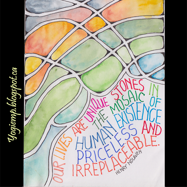 size: 6"h x 4.5"w Another linear design I started with no idea where it would lead... On Canson XL Pen &Ink Paper using a ZIG Writer for the lines and various brands of watercolors. Found a quote to go with it using Pentel Arts Fine Point Color Pens words: Our Lives are unique stones in the mosaic of human existence priceless and irreplaceable. Henry Nouwen |