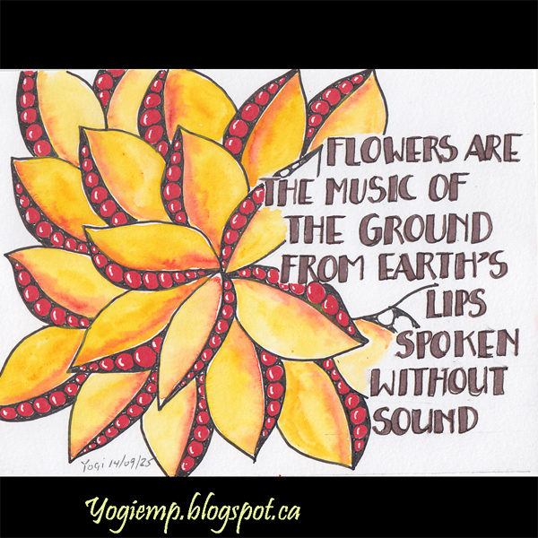 size: 6"w x 4.25"h On Canson Mixed Media paper, created the and painted with various brands of w/cf. Added gel pen highlights. Text written with a brown calligraphy marker and outlined with a Juice Up pen. words: Flowers are the music of the ground from earth's lips spoken without sound.
