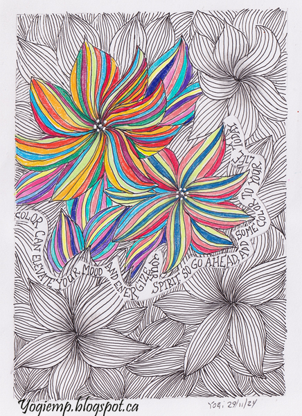 size: 5.5"w x 7.5"h I was checking Instagram again and came cross this style of doodle and was in a mood to create one myself... On Edge Mixed Media paper using a Juice Up pen and Black Edition colored pencils and add Uniball white gel pen floral dots. Since I had doodle the whole page had no place to add my quote so cut away where the quote would go. Wrote the quote on a separate piece of text paper and adhere the artwork onto that piece words: Color can elevate your mood and energize your spirit. So go ahead, add some color to your life today. |