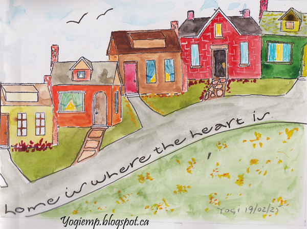 20, 2025 size: 6"w x 4.25"h I was playing with the gals again and my friend had this Art Impressions stamp set of 3 houses (w/c Cottage Set #4958) that she played with and I asked if I could borrow it... This is the result. I created masks of the 3 houses so I could overlap them in my design. Done on Canson Pen & Ink paper. Stamped with a waterproof black ink and painted with various brands of watercolor. Text written with a black gel pen. words: Home