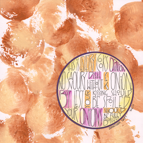 8"w X 8"h Created: April 23, 2011 Our Galleria Theme for April is Circles/Squares. You could put a circle within a square, or a square within a circle or... One of my friends had done a background using onions as a stamp and thought this was perfect for this theme. So I cut an onion in half - not easy to hold - and smeared it in some acrylic paint (Delta Ceramcoat Mocha & Parchment). Wrote my quote in a funky monoline with a black micron pen, added some colored pencil details to break up the text, then sponged a bit of Distress Scattered Straw around the edges. Cut a purple circle a tad larger and layered the two pieces, then onto my background. Quote: This is every cook's opinion no savoury dish without an onion, but lest your kissing should be spoiled your onions should be fully boiled. Jonathan Swift |