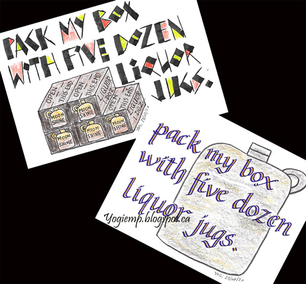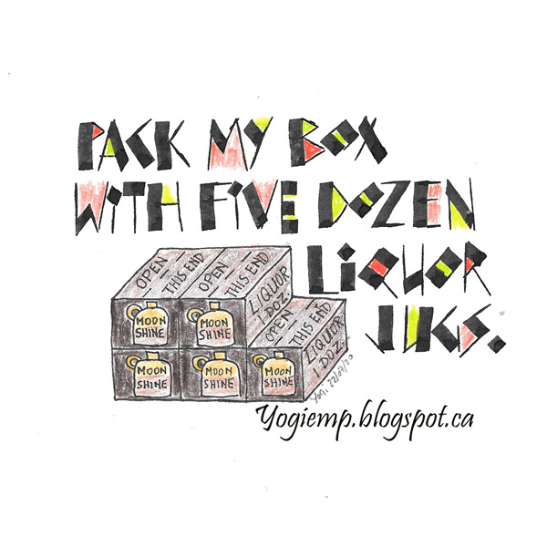 Pack My Box #1 On white 110 Staples cardstock, drew out my liquor boxes with colored pencils. Wrote my text with a 3.8 Parallel Pen and Sumi ink in a funky Neuland style. Added some color in the negative spaces. |