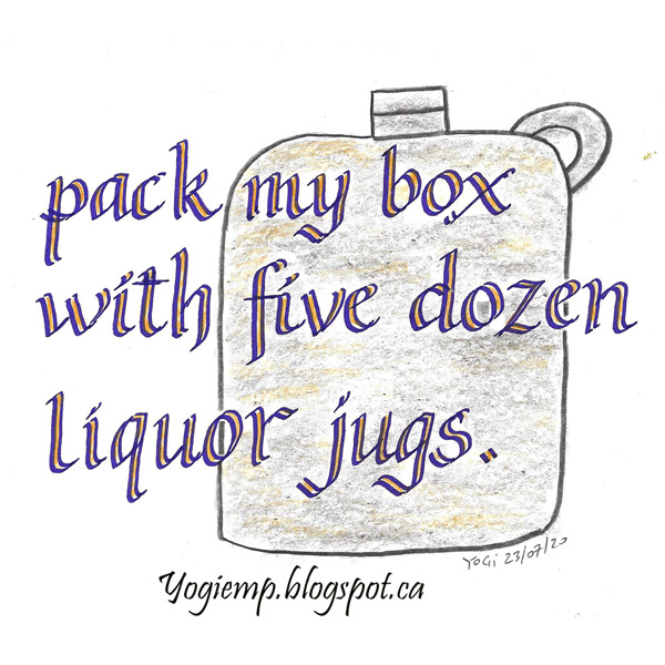 2020 Our Galleria Theme for November is something to do with "Gram" - like panagram, monogram, calligram etc. in conjunction with Covid With the way this pandemic is progressing we may run out of "liquor" like we did toilet paper and yeast... So I'm stocking up BIG GRIN.