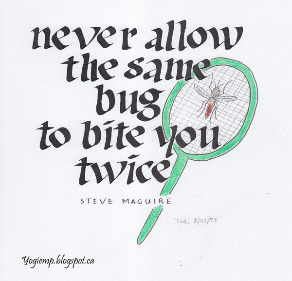 2023 Our Galleria topic for April 2023 is Bugs. On Fabriano 1264 Mixed Media paper using 4.5mm Parallel pen and Sumi ink, wrote the quote in a Bone style. Added the mosquito and fly swatter using colored pencils.
