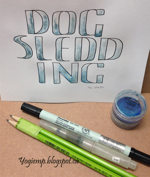 ID: Dogsledding Used 2 pencils tapped together to form the letters, then re-drew them with a Zig Writer on Super Deluxe Bee Paper. Loaded them with water and dropped in Calligraphica Crystals (from Russia) "Twilight Blue" #035. |