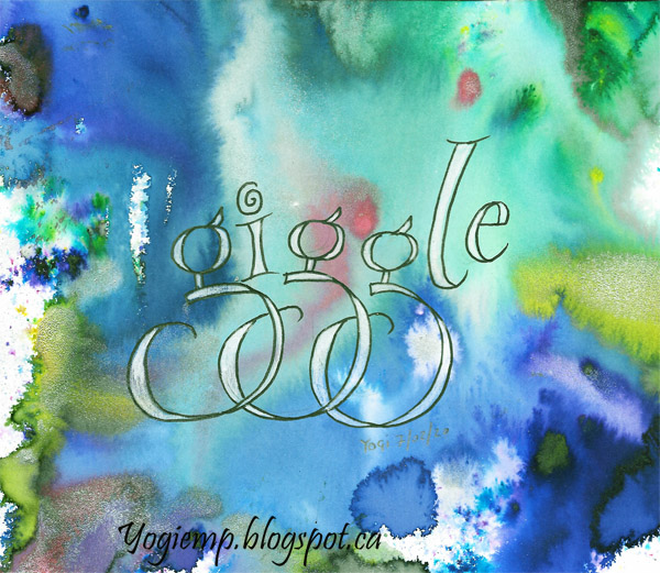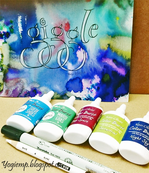 ID: Giggle Wet a piece of 140 Arches HP watercolor paper and dropped/sprinkled in various Color Burst powders. Let dry. Drew in the letters and outlined with a Zig Writer. Colored in the spaces with a Prisma colored white pencil.