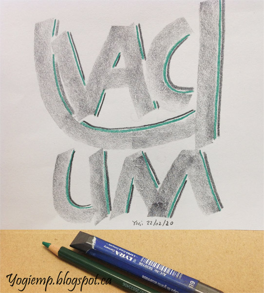 ID: "Vacuum" I'm using a Lyra water soluble GRAPHIT-KREIDE 6B pencil on calligraphy paper. I use my x-acto knife to cut away to create the flat edge pencil. (Kerri Forster from our Guild showed us this trick). I then shadowed it with the pointed end and then a Prisma colored green pencil. |