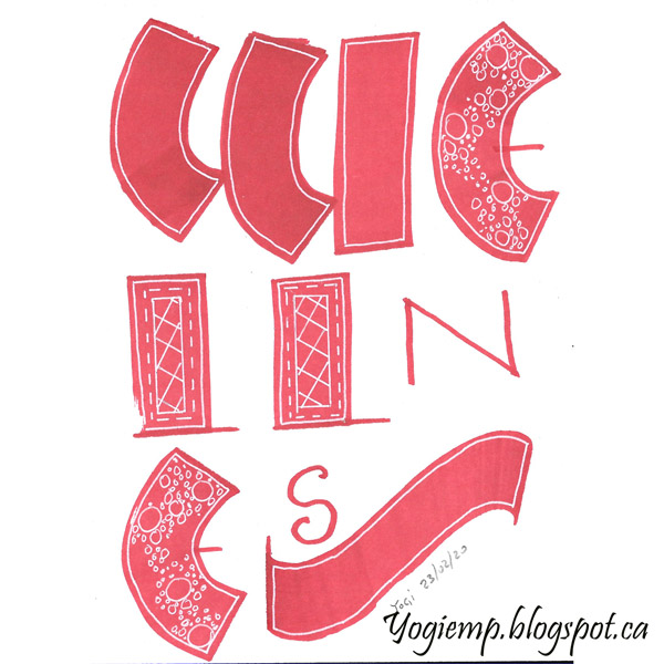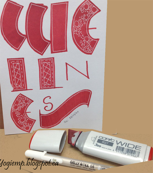 ID: "Wellness" I used a Copic Wide extra broad R27 pen on 110# Staples white cardstock. When dry doodled with a white gel pen. |