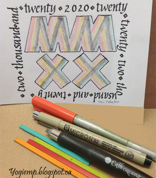 ID: "MMXX" I'm using a tool I really like (Manuscript Lettering Pencil Holder for flat lead refills), it comes with these colored leads. I started each letter with the graphite lead and then worked the colored leads on either side of that on white 110# Staples cardstock. When done, outlined with a Micron pen. Ten wrote the text around using a 1.5 Parallel pen and Sumi ink. I couldn't remember from my school days what this stood for so had to Google it... I'm using an upright italic style lettering. |