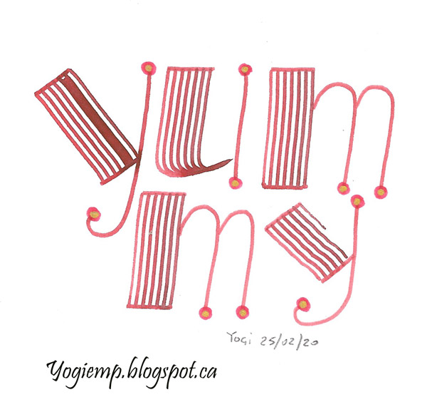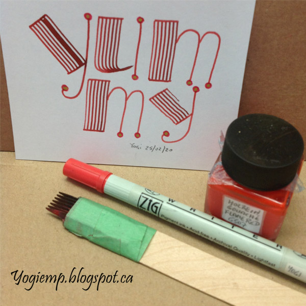 ID: "Yummy" I'm using my Stimudent tool again. I seem to be getting good use from it... and Holbein Gouache "Flame Red" on Staples white 110# cardstock. Used the red Zig Writer for the thin stroke and dots then added a gold gel pen dot in the red dots. |