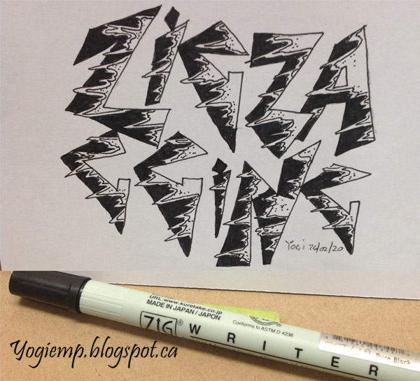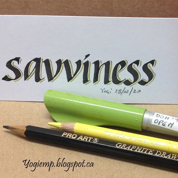 ID: "Savviness" Wrote out the word with the 3.8 parallel pen and Sumi ink in n upright Italic style. Added a graphite H shadow and filled in the area between the letter and the graphite with a yellow colored pencil on white 110# Staples cardstock. |