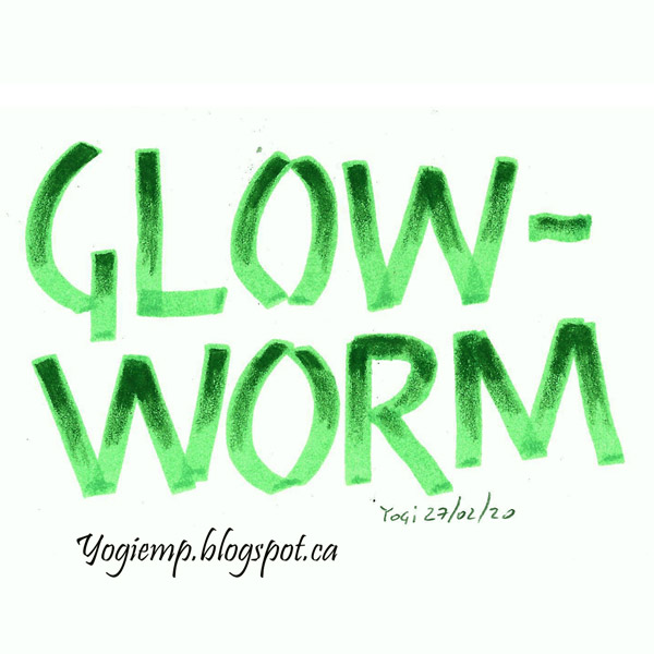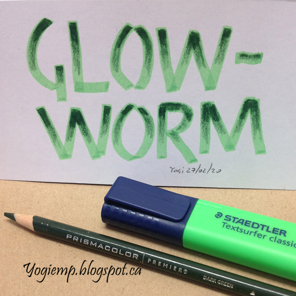 ID: "Glowworm" I looked up this word and apparently there's a cave in New Zealand full of them... Interesting images. So thought I'd use my Staedtler pen that has a neon green color to give that "glow"... then added depth at the top section of the letters with a dark green colored pencil on white 110# Staples cardstock.