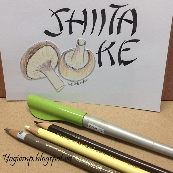 Dew my mushrooms and colored with Prisma colored pencils on white 110# Staples cardstock. I really like this style of Oriental lettering which I did using a 3.8 Parallel Pen and Sumi ink. When I finished the piece I realized I spelt Shiitake wrong - added an extra "a"... sigh. So rewrote my word and cut and pasted the mushrooms...