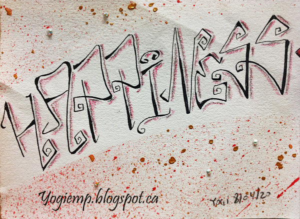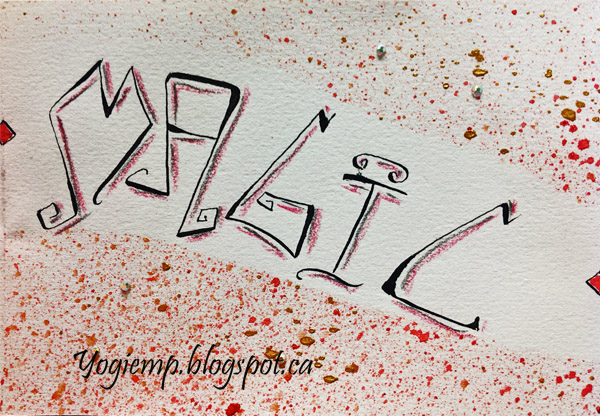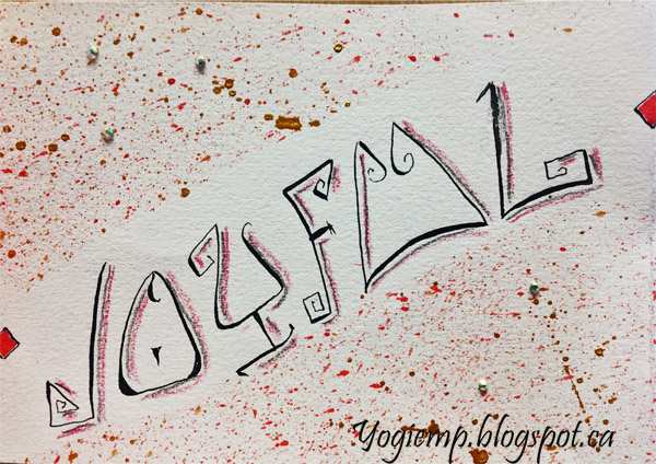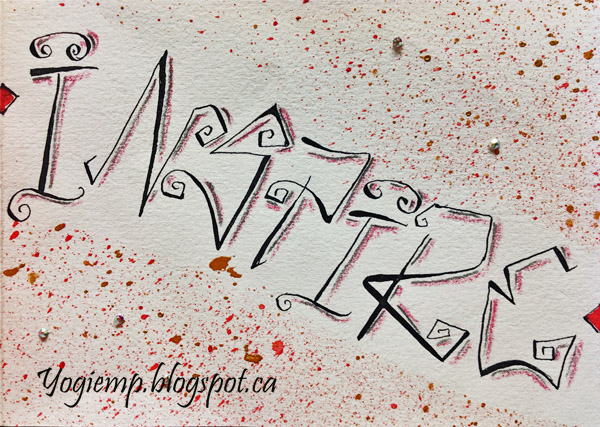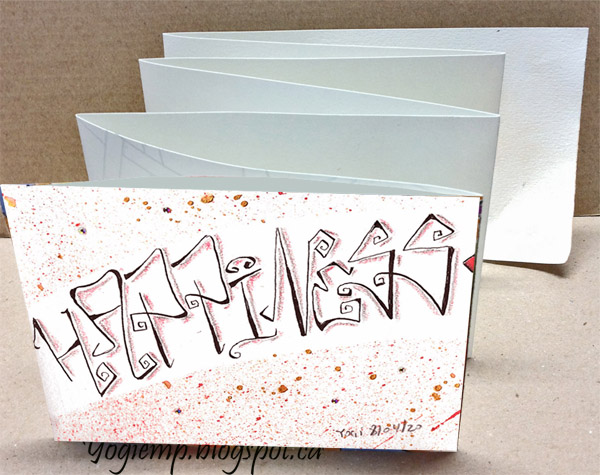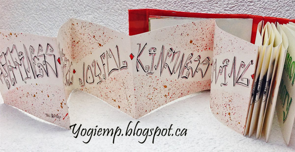 All pages are 5.5"w x 4"h and the accordion length is 38.5" plus the tab at the end to attach to the next accordion... on Arches Text Wove paper. I love this lettering style that I recently came across onLine (Initial Wall Art "Farewell Eternity" - Jo Claire Hall (Etsy). I drew the words with a Zebra G pointed pen nib and Sumi ink. Shadowed the letters with a Prisma colored pencil (Magenta) and added a 6B graphite shadow line and a small diamond shape between the word/pages. Spattered with Gansai Tambi Starry Colors "Red Gold" and US Artquest Mica Color "Stargazer". I then added a few nail art rhinestones (ss6 AB). |