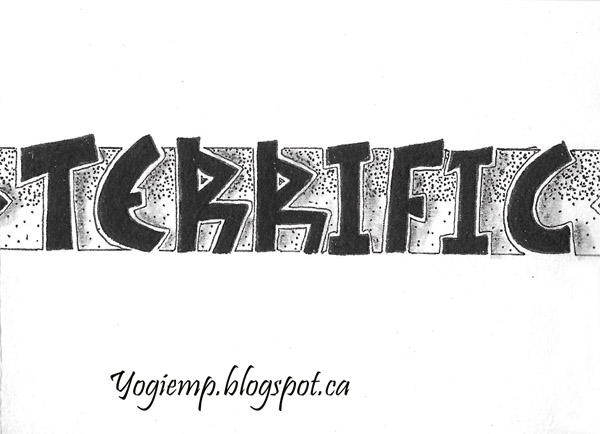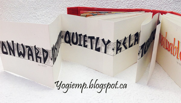 All pages are 5.5"w x 4"h and the accordion length is 38.5" plus the tab at the end to attach to the next accordion... on Arches Text Wove paper. I recently saw a piece on Pinterest I really liked using pointillism... I haven't done that style in probably 30 years... I did a piece as a project in my Graphic Design course I took at Sheridan College. It's still hanging on my wall - a big Mac truck. I drew the words in a very funky style and the pointillism using a Zig Marker. Outlined it with a .02 Micron pen. Shadowed the letters with a graphite pencil and paper stump. |
