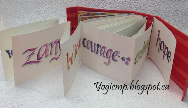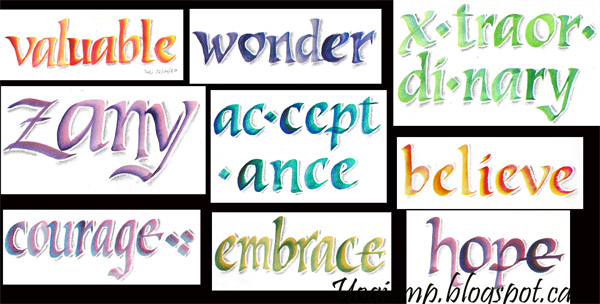 All pages are 5.5"w x 4"h and the accordion length is 38.5" plus the tab at the end to attach to the next accordion... on Arches Text Wove paper. I was playing with double loading with watercolors, which I love doing, but hadn't done for a while... so decided that would be great for this last accordion week. There are no duplicates of combos... I used a Simply Simmons Chisel edge brush - either a #8 or #10 on Arches Text Wove paper. Shadowed the letters with a graphite pencil and paper stump. |