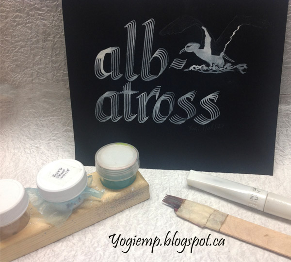 Day 1: (Albatross) Recollections black cardstock. Hand made Stimudent tool and Bleed Proof white ink wrote out the word. Drew my Albatross and colored with the white adding Wink Of Stella glitter to the wings. |