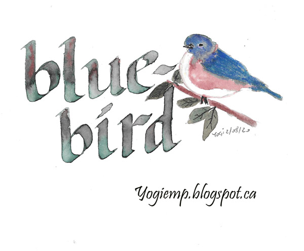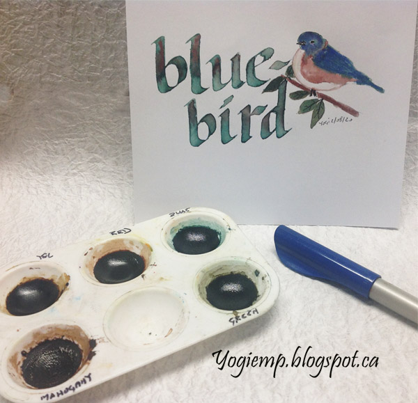 Day 2:(Bluebird) Staples white 110# cardstock. 6.0 Parallel pen and Bister ink Blue and Mahogany dropped in. Hand drew the Bluebird and colored with Derwent watercolor pencils, both plain and Inktense.