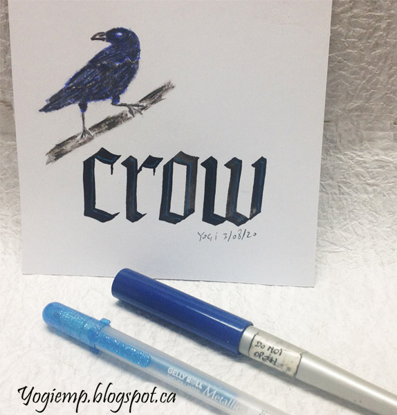 Day 3: (Bonfire) Staples white 110# cardstock. 6.0 Parallel pen and Sumi ink in a Blackletter style. Added a blue iridescent gel en line in each letter. Drew my crow and colored with Prisma colored pencils.
