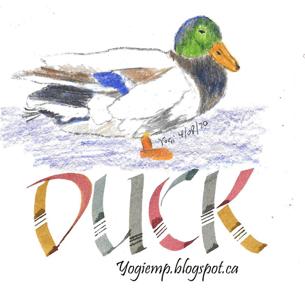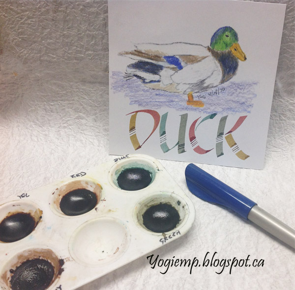 Day 4: (Duck) Staples white 110# cardstock. 6.0 Parallel pen and Bister ink (yellow, red, blue, green) in a Funky lettering style. Drew my duck and colored with Prisma colored pencils. |