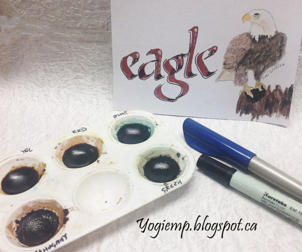 Day 5: (Eagle) On white Staples 110# cardstock. 6.0 Parallel pen and Bister "Mahogany". Shadowed with a black Zig Writer. Added white highlight. Drew my eagle and colored with Prisma coled pencils |