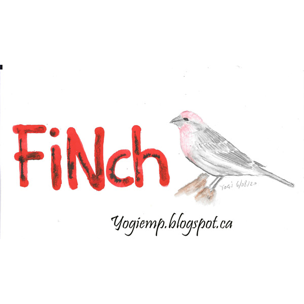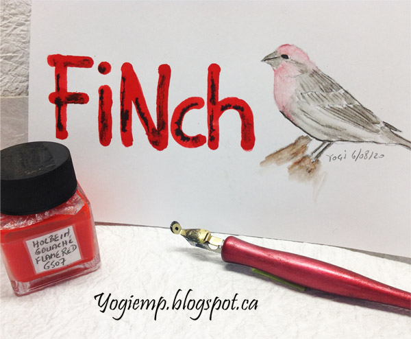 B-5 nib and Holbein gouache (Flame Red), dropping in some Sumi ink into wet letter on 110# white Staples cardstock. Finch drawn and colored with Derwent watercolor pencils.