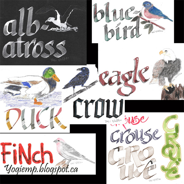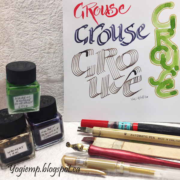 Day 7: (Grouse) All the bird images I found were just to complex... so ended up only doing different styles of lettering... On white 110# cardstock, with a red Pentel Color Brush; An Automatic pen and Holbein gouache mix of Peacock and Geranium; Hand Made Stimudent tool with Walnut Ink; B-5 nib with Holbein gouache Olive Green and outlined with a gold gel pen.