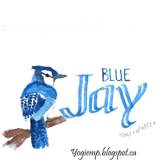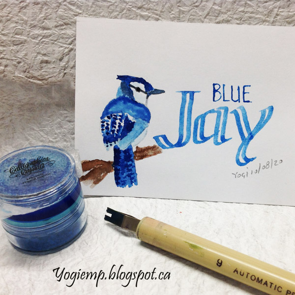 Day 10: (Jay - blue) Staples white 110# cardstock. Automatic pen and Calligraphica Crystals "Electric Blue". Bird painted with Peerless Transparent watercolors |